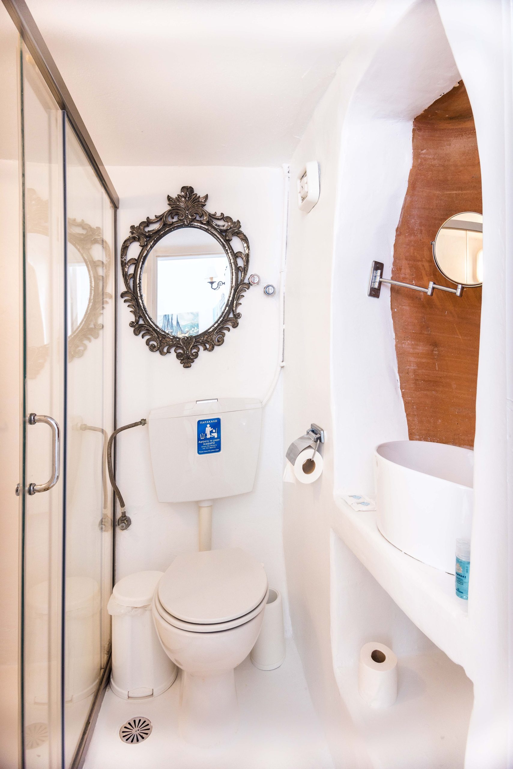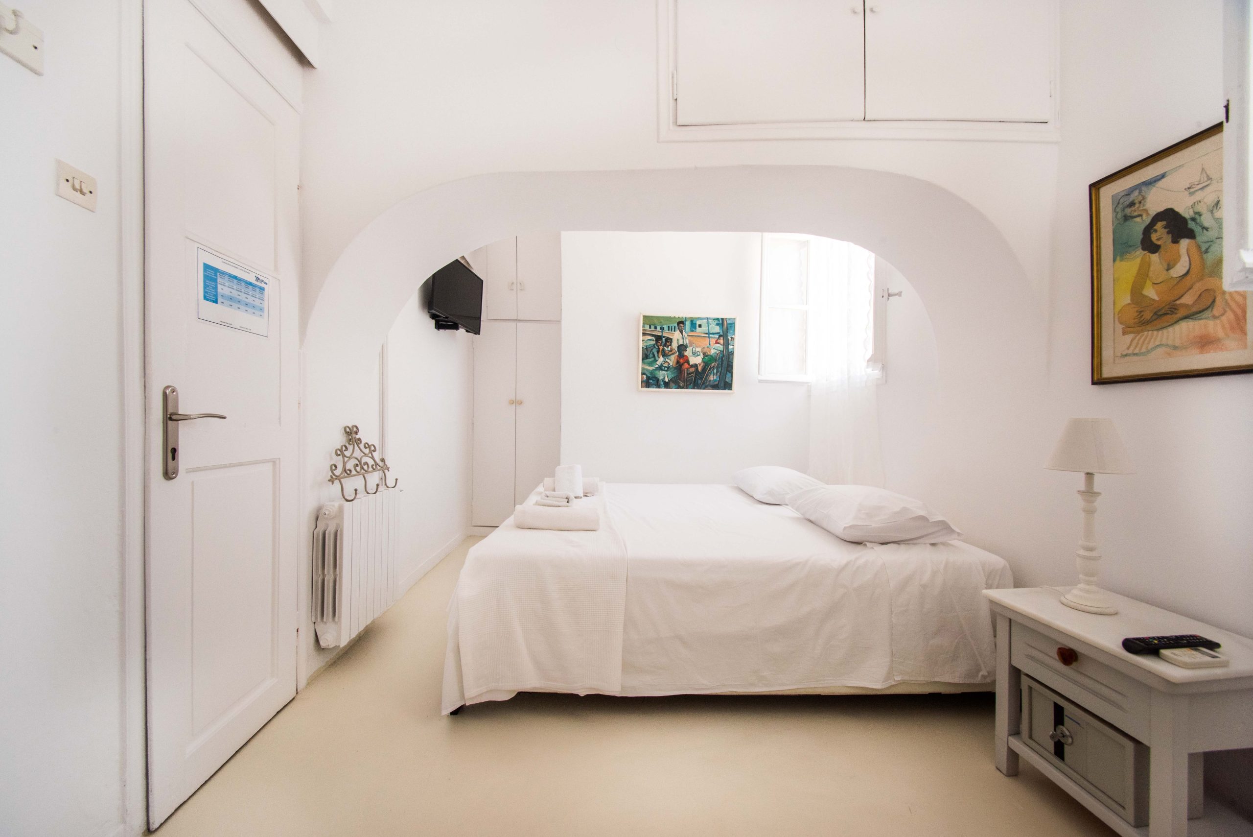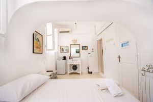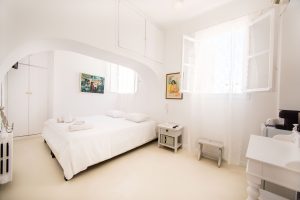 15 sqm room designed in Mykonian all-white style. The room has a double bed and a desk for writing and reading, as well as windows towards the streets. The bathroom is private.